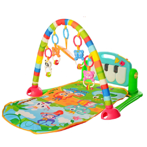 Ігровий музичний килимок розрахований для діток з народження. Килимок складається з м'якої поверхні, на якій малюк може лежати на спинці або на животі, подушечки і дуги з петельками для підвісок. У набір входять 4 підвіски-брязкальця у вигляді тварин, підвіска-дзеркальце, а також музичне піаніно. Піаніно кріпиться на спеціальній підставці до килимка. Його можна встановити вертикально або горизонтально, або зовсім від'єднати, і грати окремо. Музична панель піаніно складається з 4 клавіш, відтворюють ноти, а також двох кнопок які запускають заспокійливі мелодії й забавні звуки. Характеристики:музичні ефекти;живленняння - 3 батарейки 1.5V типу АА (не входять в комплект);розмір килимка - 71 х 47 см;розміри коробки - 50 х 8 х 37 см;вік - від народження.