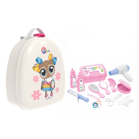 Комплектація: рюкзак, косметичка, плойка, фен, гребінець, щітка, дзеркало, ножиці, заколка гребінець, пудрениця, 4 резинки для волосся, 2 баночки з "кремом" і "шампунем", пінцет.