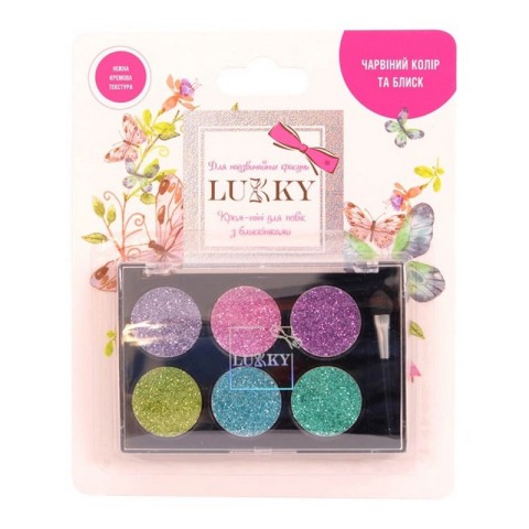 Крем-тіні для повік Lukky 6 відтінків із блискітками створять неповторний образ для дівчинки. Підійде для юних модниць. Тіні світло-блакитних і синіх відтінків доповнені блискітками. Текстура кремова й абсолютно безпечна для дитячої шкіри. У наборі: 6 відтінків тіней для повік; аплікатор. Рекомендовано для дітей від 6-ти років.