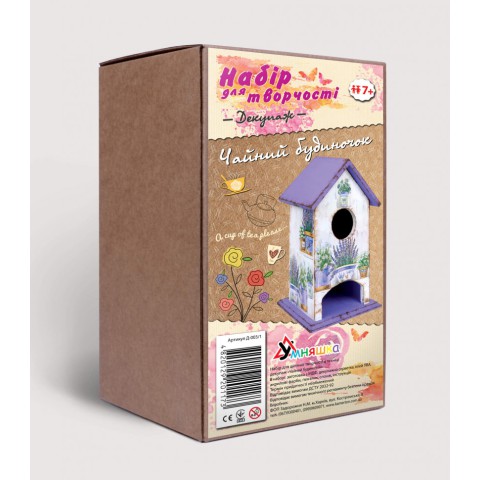 Оригінальний дитячий набір для творчості. Декупаж "Чайний будиночок лаванда" (Д-003/1) D-003/1 для малюків від семи років, відрізняється незвичайним оформленням, продуманим наповненням і чудовою якістю виготовлення. Якщо Вашого непосиду складно чимось здивувати, то йому неодмінно сподобається цей чудовий, творчий комплект. За допомогою акварельних фарб, спеціальної форми-заготовки і зручними, ергономічними пензлика Ваша дитина зможе створити розкішну саморобку - справжній витвір мистецтва, красивий чайний будиночок. Свій перший декупажний шедевр Ваш малюк помістить в дитячій кімнаті або на кухні в якості прикраси, і буде з гордістю його демонструвати гостям. Цікавий, кропіткий процес малювання занурить Вашої непосиду в чарівний барвистий світ, посприяє розвитку творчих здібностей, логічного і асоціативного мислення, уважності, посидючості, фантазії.