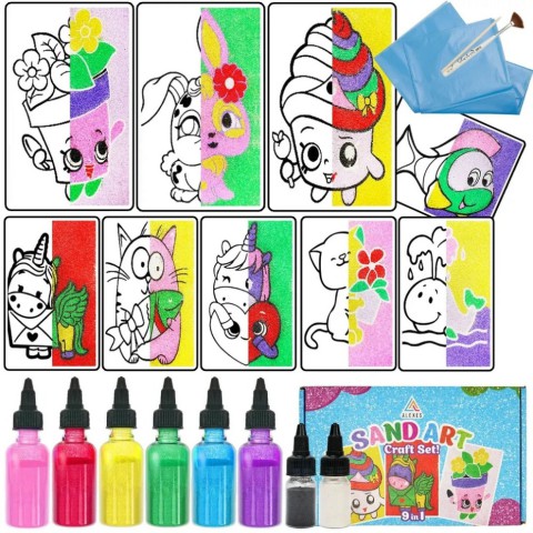 Представляємо вашій увазі новий творчий набір малювання піском, що містить 9 різних картинок і 3 з яких з магнытами, колірну палітру піску, які допоможуть вам створити найкрасивіші картини з піску.