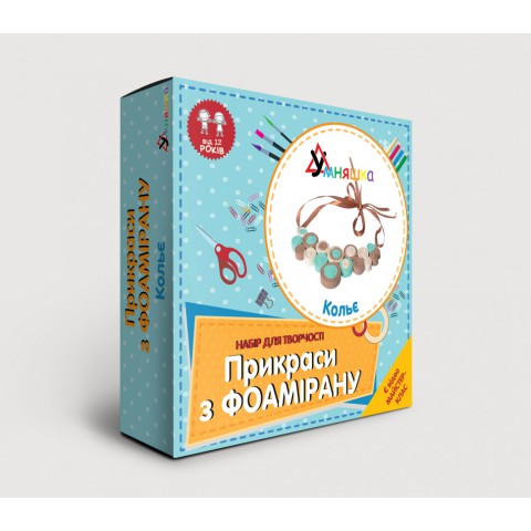 В даному наборі ви знайдете: 1.фоаміран 3 кольорів - по 3 смужки довжиною 29 см і шириною 2 см кожного кольору 2.клей, рукавичка 3.намистини - 2 шт. 4.стрічка 6.піни для фіксації стрічок - 3шт. Додатково знадобляться: лінійка, ножиці і гостра паличка для нанесення контуру. Підсумок роботи - стильне кольє з фоамірану.