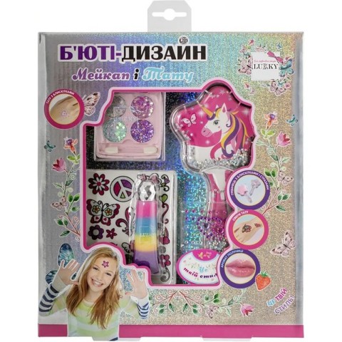 Набір косметики для дівчат "Мейкап і тату" марки "Lukky". Набір складається: блиск для губ полуничне суфле - 1 шт тіні для повік з блискітками на гелевій основі палетка 4 кольори (перламутровий, блакитний, 2 відтінки фіолетового, з аплікатором) блискітки-наклейки - 1 лист тату з блискітками - 1 лист щітка для волосся - 1 шт Кожна дівчинка легко зможе створити свій неповторний образ з косметикою Lukky легко та весело!