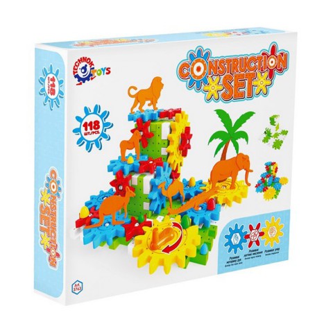 Конструктор з шестернями дарує дітям подвійну радість. 118 яскравих деталей з якісної пластмаси значно урізноманітнять процес складання конструктора та захопливі ігри з ним. Після того, як дитина об’єднає шестерні, пластини-пазли, фігурки звірів, пальми та інші елементи конструктора, вона отримає захопливу конструкцію, якою дуже цікаво гратися.