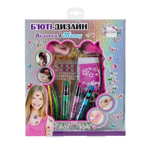 Набір для б'юті-дизайну Lukky Волосся і тату - це чудовий подарунок для дитини, яка захоплюється б'юті-дизайном. Набір зроблений з якісного гіпоалергенного матеріалу та розвиває уяву, увагу, творчі здібності, фантазію і дрібну моторику. У наборі: різнокольорові коси-пасма; гумки з помпонами; блискучі татуювання; трафарети; ручки для татуювань. Рекомендовано для дітей від 5-ти років.