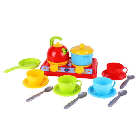В комплект входить також чайний сервіз на 4 людини, 4 ложки, чайник, каструля і сковорода.