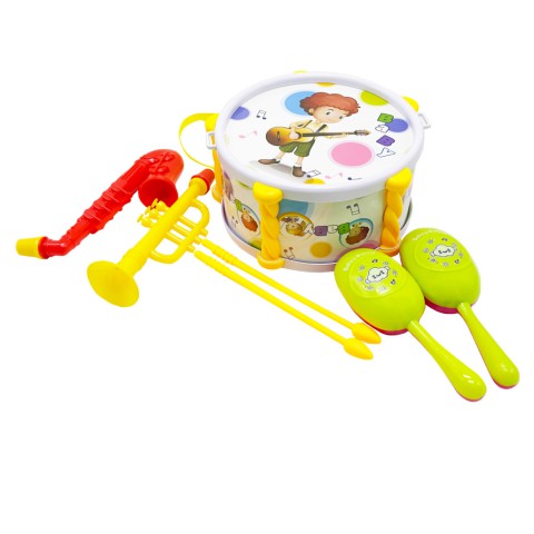 Дитячий набір музичних інструментів - чудовий старт для маленького музиканта. У комплекті барабан діаметром 18 см, 2 палички та інші інструменти. Виготовлений із пластику, легкий і зручний для дитячих рук.