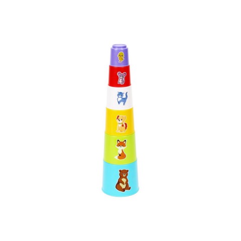 6 різнокольорових формочок для піску, які малюк складає в пірамідку заввишки 35 см або вкладає один в один. На кожній формочці - веселий звірок.