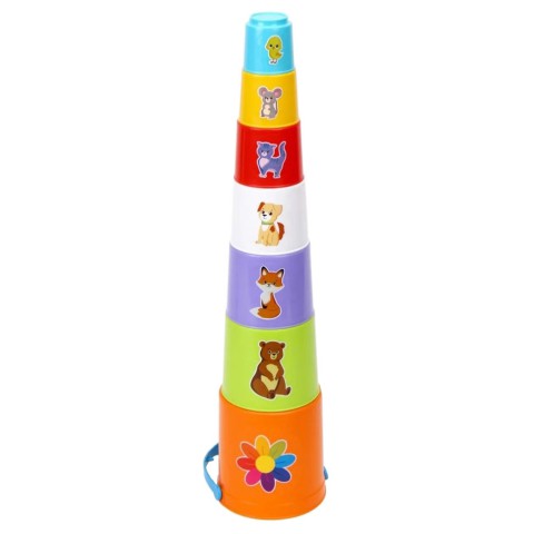 6 різнокольорових формочок для піску, які малюк складає в пірамідку заввишки 35 см або вкладає один в одного. На кожній формочці - веселий звірок.
