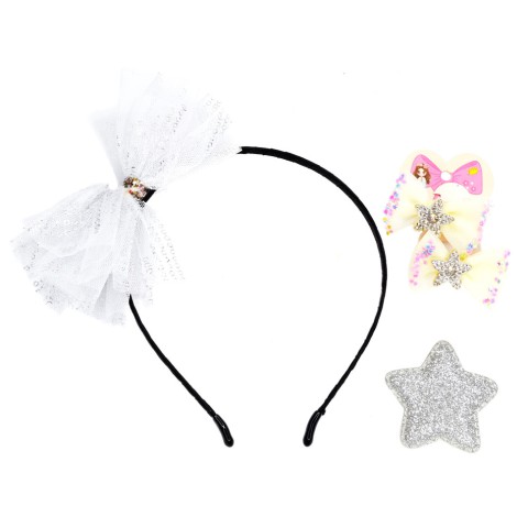 Дитячий набір містить стильний ободок, резиночки та затискач для волосся. Ідеально підходить для створення яскравих і грайливих зачісок. Чудовий вибір для вашої маленької модниці!