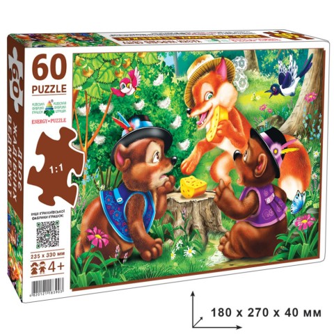Серія цікавих пазлів-головоломок із 60 елементів за мотивами казок народів світу.На ігровому полі розміром 235 х 330 мм зображено сюжет з казки ДВОЄ ЖАДІБНИХ ВЕДМЕЖАТ. Поле розрізане кривими лініями на 60 частин, з яких потрібно зібрати цілу картинку.Гра розрахована для дітей віком від 4 років