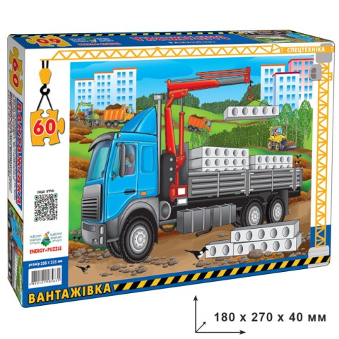 Серія цікавих пазлів-головоломок із 60 елементів з різними видами спеціального транспорту.На ігровому полі розміром 235 х 330 мм зображено автомобіль ВАНТАЖІВКА. Поле розрізане кривими лініями на 60 частин, з яких потрібно зібрати цілу картинку.Гра розрахована для дітей віком від 4 років