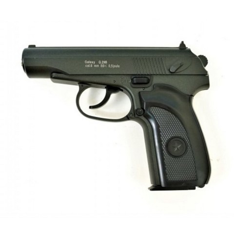 Страйкбольний пістолет Galaxy G.29B (ПМ), чорна рукоять – це пружинна вітчизняного Макарова, виконана азійським виробником пневматики для стрільби на короткі дистанції. Виріб належати до модифікацій з хорошою працездатністю в будь-яких умовах, при цьому не потребує розхідників (крім боєприпасів) і володіє високим ступенем безпеки. Розпрямляючись, вона повідомляє кулькам ВР енергію, необхідну для польоту. Початкова швидкість пострілу близько 50 м/с. Магазин пістолета на 12 боєприпасів. Розмір дульної енергії – трохи більш як 0,5 Дж, Пістолет має суцільнометалевий корпус, використовувані у виробництві матеріали – метал з цинком і пластик. Стрілянина можлива лише в одиночному режимі вогню. Використовуються відкриті прицільні пристрої. Зовні і за габаритами пістолет схожий з вогнепальним аналогом, на рифленій рукоятці чорного кольору добре впізнавана п'ятикутна зірка.