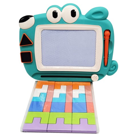 Магнітна дошка для малювання. Малювати за допомогою ручки-стікера і штампиків-печаток 2-х видів + тетріс. Під час переміщення важеля праворуч внизу дощечки, малюнок зникає. Дошка має зручну ручку для перенесення. Дошка укомплектована двома штампиками та ручкою-стікером.