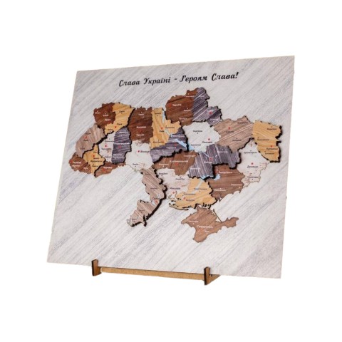 Дерев’яна карта України на підставці — це стильний подарунок. Вона прекрасно впишеться в інтер'єр будь-якого офісного приміщення та дому. Карта з натурального дерева, виконана як двошарова з окремих елементів, підкреслить хороший смак господаря. Невеликі розміри карти 310 на 270 мм та спеціальна підставка дозволять розташувати її на столі, бюро, поличці, у відкритій шафі.