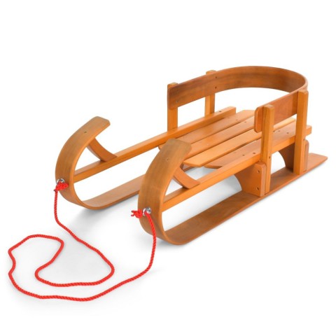 Конструкція санок виготовлена з міцного дерева, посилена металевими кріпленнями, що гарантує довговічність та стійкість навіть при активному використанні. Висока спинка надійно підтримує дитину, запобігаючи падінням, а мотузка дозволяє легко керувати санками, роблячи катання комфортним та безпечним.