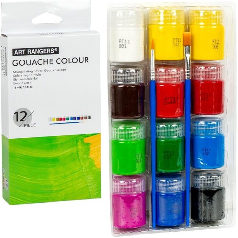 Набір гуашевих фарб ART RANGERS містить 12 баночок по 15 мл та 2 пензлі. До комплекту входять різноманітні насичені кольори: білий, жовтий (два відтінки), червоний (два відтінки), коричневий, чорний, зелений, салатовий, синій, блакитний і рожевий. Фарби мають високу покривну здатність, яскраві відтінки та добре змішуються між собою. Завдяки спеціальній формулі легко змиваються водою, що робить їх безпечними для дітей. Зручна упаковка з прозорим лотком дозволяє зручно зберігати фарби та швидко знаходити потрібний колір. Ідеально підходить для малювання на папері, картоні та інших пористих поверхнях.