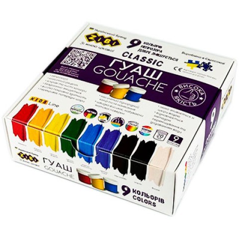Фарби гуашеві Classic, 9 кольорів, 20 мл, картонна коробка, Kids Line, ZB.6611
