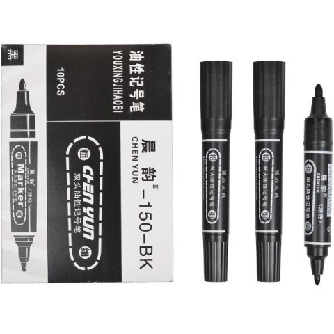 Перманентний маркер для написів на різних поверхнях: шкірі, деревині, гумі, пластмасі, склі, металі. Чорнило на спиртовій основі, водостійкості, термостійкі, не стираються, практично без запаху. Маркер залишає яскравий, чіткий, безперервний слід. Конусоподібний пишучий вузол. Необхідно зберігати тільки в горизонтальному положенні. Товщина лінії письма: 2-3 мм і 3-4 мм. Колір чорнила: чорний.
