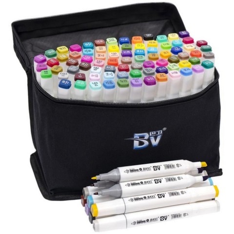 Набір двосторонніх фломастерів / скетч маркерів на спиртовій основі. У наборі 80 штук у сумці. З одного боку звичайний фломастер, з іншого боку скошений маркер. Кожен колір має свій цифровий код, який нанесений на ковпачок маркера. Ковпачки щільно закривають маркер, перешкоджаючи висиханню. Чорнило на спиртовій основі добре вбирається в папір, тому рекомендується використовувати щільні аркуші або картон.