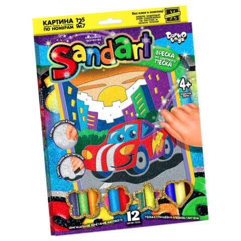 Займаючись з набором для творчості "SandArt" фреска із піску 7652DT, Ваша дитина навчитися самостійно, своїми руками створювати красиву річ - неповторну, яскраву картинку. Унікальну готову фреску з різнобарвного пісочку Ваша донечка зможе подарувати друзям або родичам, або прикрасити нею свою кімнату. Матеріал для креативних занять розроблений з нетоксичної, антиалергенної сировини без неприємного запаху, яке не виділяє їдких речовин, здатних негативно впливати на дитяче здоров'я. У набір входить спеціальний кольоровий кварцовий пісочок, гліттер, а також платформа з самоклеючоюся основою. Щоб створити малюнок, необхідно відклеїти захисну плівку, і на обрану ділянку нанести потрібний колір. Представлений в оновленій, розвиваючій колекції торгової марки Danko Toys для діток від 4-х років, цей набір відмінно розвиває не тільки дрібну моторику і уяву, а й допомагає дитині впоратися з негативними переживаннями, забути про стрес, поліпшити асоціативне мислення, сенсорику і візуальне сприйняття .