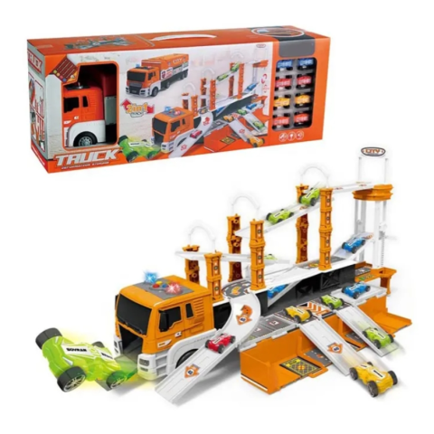 Гараж трейлер, 42 см, інерційний, гараж/трек 50x38x31 см, звук, світло, машинки 8 шт. 4.5 см, 58.5x22x15 см