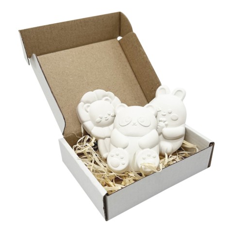 У наборі ви знайдете панду, зайчика з морквою та левеня - кожна фігурка (приблизно 8 см) має свій унікальний характер, тому їх цікаво розфарбовувати.