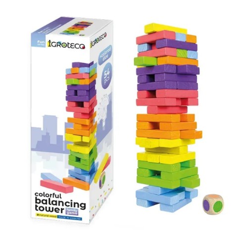 Настільна гра "Вежа-балансир" IGROTECO з 54 дерев'яних брусків та кубиком – класика для сімейного дозвілля! Розвиває моторику, логіку, терпіння.