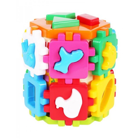 Куб-конструктор з різноманітними геометричними фігурками та фігурками тварин, які вставляються у відповідні отвори основи. Розвиває логічне мислення, моторику пальців, пам'ять.