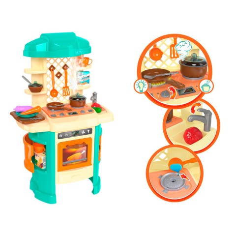 на думку дизайнерів, найкраще передає домашній затишок справжньої кухні. Таке колірне рішення буде відповідати не тільки мріям маленьких господинь, а і майбутніх шеф-кухарів. І, хто знає, можливо ця кухня стане для малюка першим кроком у захоплюючий світ сучасної "високої кулінарії». В наборі разом з іграшковій кухні весь необхідний посуд для приготування смачних страв. Є каструлька з прозорою кришкою (з отворами для проходження пара), сковорідка, дошка для нарізки і яскраві овочі. Дві картонні коробочки з «спагетті» та «пластівці» для приготування корисних сніданків, а для чаювання - дві чашки з блюдечками і цукорниця. А після смачного обіду - треба помити посуд. Для цього є мийка із краном і мочалка у формі квіточки.