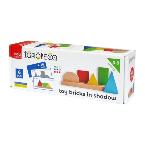 Фігури і тіні – це унікальна іграшка для розвитку окоміру та логічного просторового мислення!До набору входять 5 різнокольорових геометричних фігур (червоний квадрат, салатовий прямокутник, натурального кольору дерева півколо і два різних трикутники – жовтий, менший та синій, більший), а також дошка-основа з трьома повздовжніми пазами. Задача дитини – поставити фігури в пази основи таким чином, щоб зображення відповідало завданню в книжечці-інструкції. У який з пазів основи поставити синій трикутник, щоб він наполовину сховався за червоним квадратом і не закривав собою півколо, яке ховається за жовтим трикутником? Цікаво? Ця гра захопить уваги не лише дітей, а й дорослих! Підходить для самостійного використання, а також для роботи з групою дітей, у сімейному дозвіллі, тощо.Завдання є трьох типів: простіші для початку гри – коли використовується 3-4 фігури для побудови відповідної конструкції, середнього рівня складності – коли усі 5 фігур задіяні, і кожна фігура зображена у завданні своїм кольором, що є підказкою. Третій рівень складності – без кольору в завданнях, тобто фігури зображені тінями – вони усі сірі. Тут потрібна увага, логічне мислення і посидючість! Але ж яка приходить радість, коли усе вийшло! Правда?