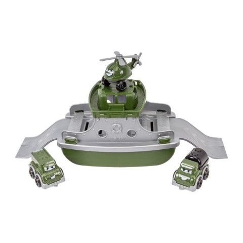 Іграшковий пором у стилі Мілітарі - це захоплива іграшка для дітей із цікавим і сучасним дизайном. Великий, міцний водний транспорт для перевезення десантників, військової техніки та боєприпасів. Конструкція іграшкового порома дає змогу йому транспортувати через водні перешкоди улюблені іграшки. З ним весело грати у ванній, на річці та на пляжі."Пором" обладнаний двома трапами, для заїзду та з'їзду автомобілів. Під час руху по воді трапи ховаються в корпусі і не заважають руху. До складу іграшки входить 2 машинки (десантне авто, бензовоз) і вертоліт. З емоціями машинки, немов "оживають" і перетворюються на відважних воїнів.Завдяки цьому, діти зможуть створити цікаві ігрові сюжети, які стосуються транспорту військового призначення. Для більшої реалістичності, іграшковий пором має колірну гаму, яка повністю відповідає стилістиці військових транспортних засобів.На палубі порома є спеціальні місця для фіксації транспорту під час руху по воді, а у верхній частині - майданчик для вертольота."Пором із набором транспорту" неодмінно сподобається вашим малюкам і зробить водні процедури захопливими та цікавими.Спеціальні отвори в корпусі дають змогу легко злити воду з порома та висушити його. Так іграшка залишатиметься чистою та безпечною для малюків.Іграшка "Пором із набором транспорту ТехноК" виготовлена з міцного нетоксичного пластику. Застосування тільки високоякісних барвників забезпечує яскравий колір протягом тривалого терміну використання.