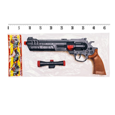 Пістолет з оптикою працює з механічним обертовим диском всередині, який створює звук і іскри, довжина - 37 см, висота - 16 см.Комплект: пістолет, оптичний приціл.Упаковка: прозорий поліпропіленовий пакет.Вага: 128 грам.