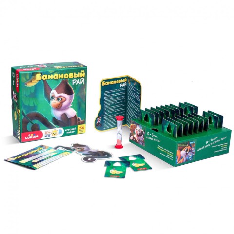 Ігровий набір унікального формату: гра-зачіпка для 2 гравців + розповідь + аудіоказки. Розрахований на дітей 2-5 років. Малюки мають разом з мавпочкою збирати банани, рахувати їх, бути дуже уважним і не схоплювати бананову шкірку. Пісочний годинник допоможе в змаганнях на швидкість.Комплектація: ложемент, двосторонні картки із зображенням бананів (20 шт.), фігурка мавпочки, листівка з розповіддю, пісочний годинник, інструкція, посилання на аудіо-.Розмір коробки: 20 × 20 × 6,8 см.