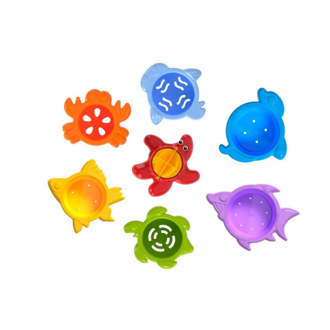 Нова «Пірамідка» - справжня знахідка для веселих і повчальних ігор. Іграшка складається з семи елементів різного кольору і розміру. При цьому кожен елемент - ще й цікавий морський мешканець: дельфін, морський котик, краб, черепашка, морська зірка і рибки.Всі елементи можна зібрати пірамідку від більшого до меншого, чи вкласти один в один. Розміри кожної фігури підібрані пропорційно - сама велика «акула», а найменша «морська зірка». Кольори - як веселка, від червоного до фіолетового.На верхній фігурі «морська зірка» є млин, яка обертається при наливанні водички. Через різні ситечка на дні кожної формочки водичка «втече з пірамідки». І так можна грати багато разів. Елементи пірамідки також добре використовувати як пасочки, а ситечко на дні - як штамп на піску.Але крім розваг, ще й навчання. Побудувати і зруйнувати піраміду, вивчити кольори, розміри, форми, познайомитися з морськими мешканцями, і зробити перші кроки в рахунку. А ще безліч ідей, які придумає Ваш малюк. Адже така іграшка добре розвиває дрібну моторику, координацію, пам'ять, логіку і уяву.Іграшка для дітей від 1 року. Упаковка: сіточка з кольорової картонної етикеткою.