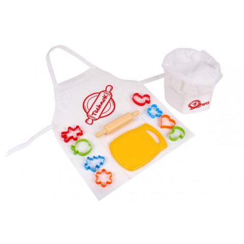 У наборі від ТехноК є все необхідне для перших кондитерських шедеврів: 8 кольорових формочок, дощечка і качалка. Можна вирізати тістечка різної форми, вибравши що Вам подобається. З такою іграшкою Ваш малюк відчує себе професійним шеф-кухарем, оскільки в наборі є білий фартух з яскравим малюнком і справжній кухарський ковпак. На допомогу мамі додаємо рецепт смачної випічки. Тістечка з шоколадом, горішками або родзинками - вирішувати це тільки маленькому шефу!Всі елементи виготовлені з якісної і безпечної пластмаси, без запаху.