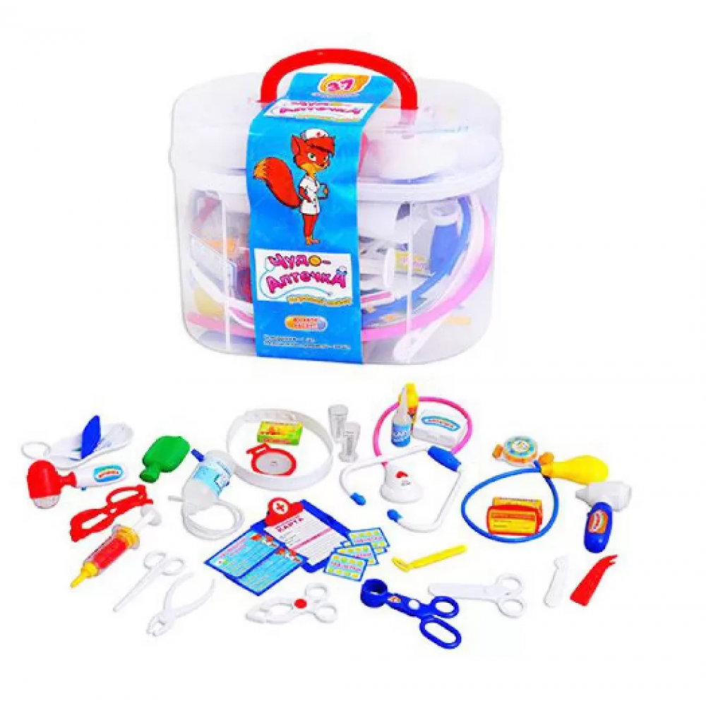 Склад ігрового набору Доктор М 0461: велика аптечка-валіза, тонометр, фонендоскоп, грілка, молоточок, термометр і ін. Всього 37 мед. інструментів.