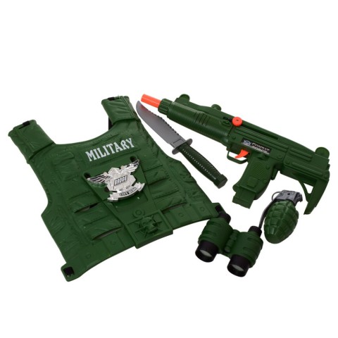 Дитячий ігровий набір військового - це набір, який містить у собі елементи, що імітують екіпіровку. До набору входять шолом, куртка, автомат узі, бінокль, ніж і бронежилет. Загалом, дитячі ігрові набори військового для розваги та гри, а також для допомоги дітям у професії військового та навчанні основ безпеки.