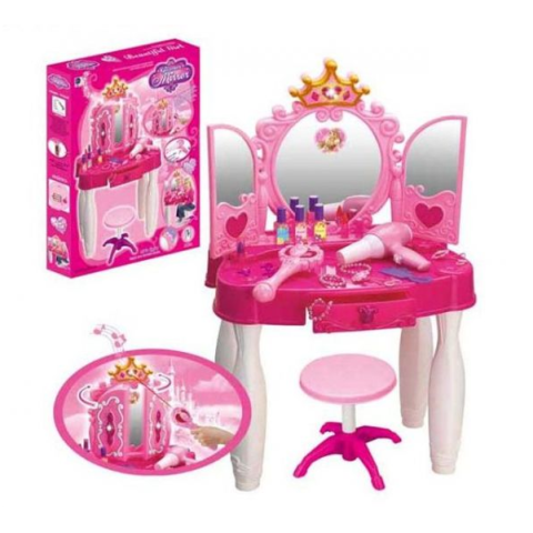 У набір входить: туалетний столик з дзеркалом (трюмо), стільчик, косметика, гребінці та аксесуари для волосся.