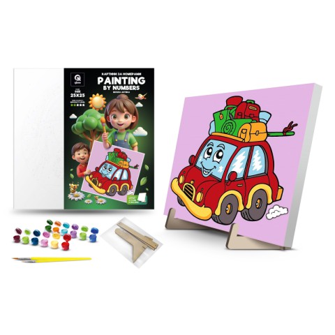 Купіть картину за номерами Qbee Весела автівка з дерев’яною підставкою 25×25 см для релаксу!
