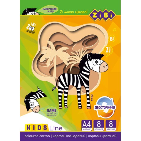 Картон кольоровий двосторонній (целюлозний) А4, 8 кольорів, 8 аркушів, 200 г/м², KIDS Line