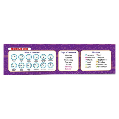 Картонна закладка-шпаргалка для книг з англійської мови для вивчення днів тижня, місяців і часу. Практичний аксесуар для школярів 1—5 класів.Матеріал закладинки: КартонРозмір: 200x50 мм