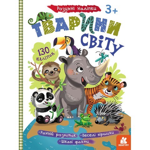 Книга КЕНГУРУ Розумні наліпки, Тварини світу (українською) - Досліджуйте тварин із книгою "КЕНГУРУ Розумні наліпки: Тварини світу" (українською)! Для дітей від 3 років, ця книга з наліпками розвиває уяву та дрібну моторику через створення сцен із тваринами світу. Безпечна і яскрава, ідеальна для дошкільнят. Творіть на Demsky.com.ua!