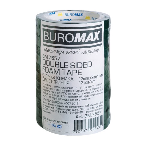 Стрічка клейка двостороння, на пінній основі, 12 мм х 2 м, чорна, 12 шт. в упаковці
