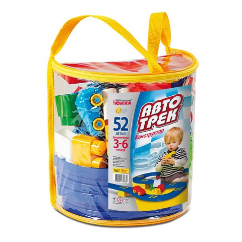 Яскравий пластиковий конструктор із 52 деталей, з якого можна зібрати трек, трасу для машинок, які також йдуть у комплекті.