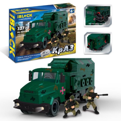 Конструктор IBLOCK Армія КрАЗ Штабна машина, PL-921-514, 327 деталей, 2 фігурки, 37.5x6x26 см