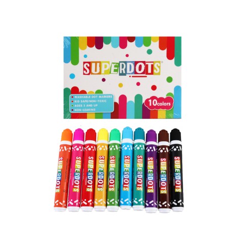 Набір з 10 яскравих крапкових маркерів на водній основі для творчості, скрапбукінгу та декору. Наконечник у формі губки дозволяє робити чіткі круглі відбитки різного діаметра. Безпечні, нетоксичні фарби легко відмиваються з рук та одягу. Купуйте маркери Superdots для створення унікальних малюнків, прикрас та розвитку художніх навичок дитини!