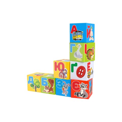 Набір складається з 9 різнокольорових кубиків з буквами українського алфавіту і малюнками. На кожній грані кубика - буква і зображення предмета, назва якого починається на цю букву. Розмір кожного кубика: 7х7х7 см.Розмір упаковки: 21х21х7 см.