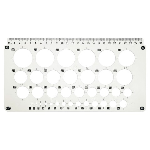 Виготовлена з пластику, має шкалу на 25 см. Додатково оснащена облямівками для креслення кіл діаметром від 1 до 30 мм (до 36 мм включно), що дозволяє швидко та акуратно створювати окружності різного розміру.
