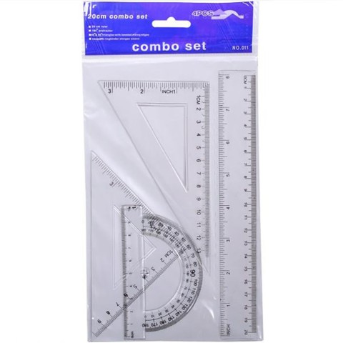 У комплект входить Лінійка 20 см, трикутник (30х90х60), транспортир, трикутник (45х90х45).